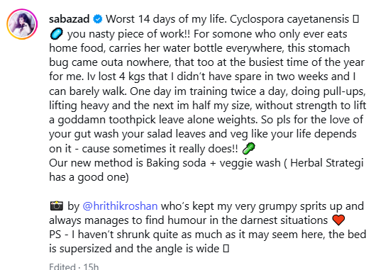 Saba further wrote, “In two weeks, I lost 4 kg of weight, which was already not much. The condition is such that I am not able to even walk properly. One day I was training twice a day, doing pull-ups and lifting heavy weights, and the next day I became so weak that I did not have the strength to even lift a toothpick. So please, take care of your stomach. Wash salads and vegetables thoroughly, as if your life depends on it.” Sometimes it really is!”