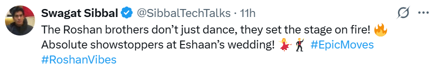 Another fan wrote- ‘Roshan Bhai not only dances but also sets the stage on fire. He was the showstopper in Ishaan’s wedding. One wrote on X- ‘Wow, fantastic. Watching Hrithik dance is mesmerizing.