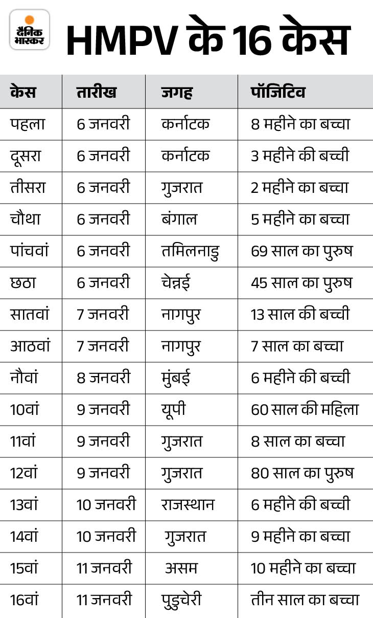 Gujarat has the highest number of 4 cases of HMPV in the country. 3 cases have been reported in Maharashtra, 2 each in Karnataka and Tamil Nadu, one case each in UP, Rajasthan, Assam and Bengal.