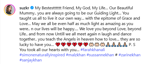 While sharing a video of the moments spent with mother Zarine Khan, Sussanne Khan has written, ‘My dearest friend, my God, my life, our beautiful mother, you will always be the light to guide us, you taught us that life should be lived in our own way by becoming an example of dignity and love, if only we could all be half as bright and amazing as you, then our life would be filled with happiness.’