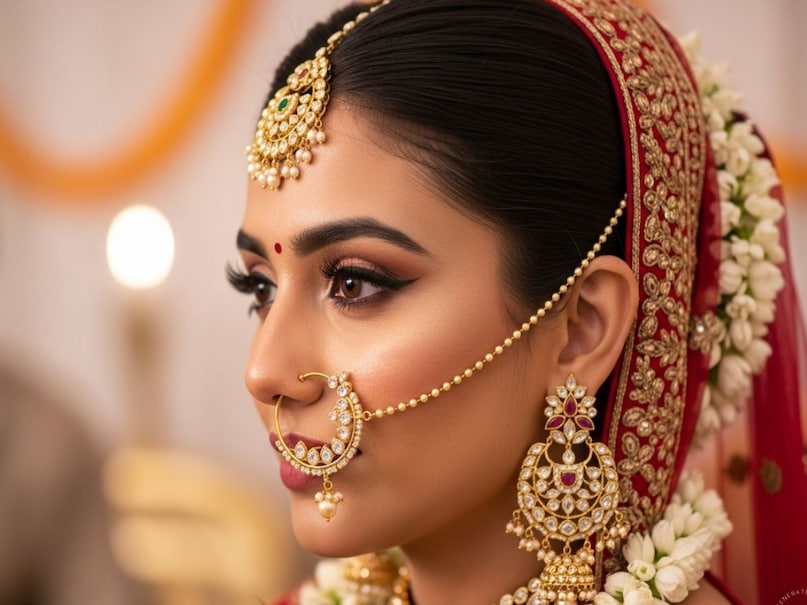 Oversized Bridal Nath – These are much larger than the classic traditional nath that brides have been wearing at weddings for years. The big ring is studded with kundan, gems, polki, pearl etc., which is quite heavy in appearance. It adds beauty to the bride’s face.