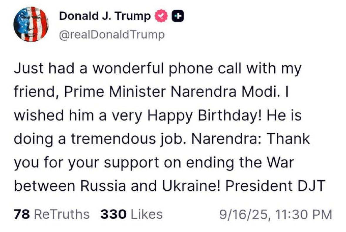 Trump wrote on Truth, ‘Just had a very good conversation with my friend, Prime Minister Narendra Modi on the phone. I wished him a lot of birthday! They are doing very good work. Narendra: Thank you for your cooperation in ending the war between Russia and Ukraine! President DJT. ‘