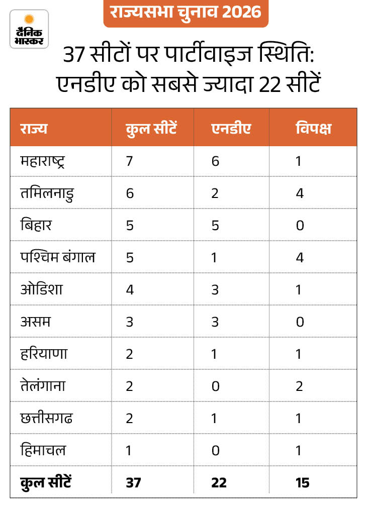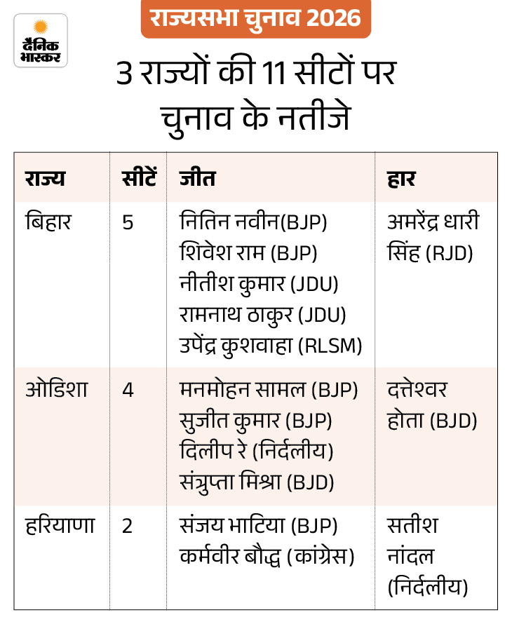 Out of these 37 seats, candidates were elected unopposed on 26 seats. Elections were held on 11 seats in three states Haryana, Bihar and Odisha. Of these, 9 seats went to NDA’s account. The opposition got 2 seats. Congress MLAs cross-voted in Odisha and Haryana. In Bihar, 4 opposition MLAs did not come to cast their votes. BJP benefited from this.