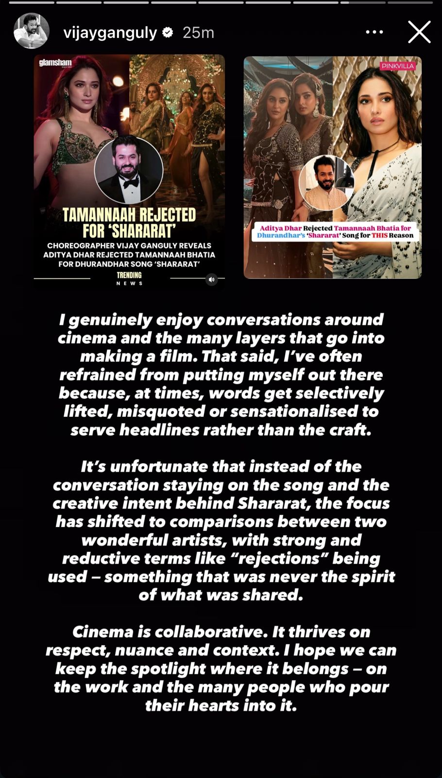 After the release of Dhurandhar, the film’s choreographer Vijay Ganguly had said in an interview that he first wanted to film the song with Tamanna, but director Aditya Dhar refused. After this, news started coming that Tamanna was removed from the song. However, the choreographer later clarified that Tamanna’s name was only considered and she was never offered the song. He had given clarification on his statement on social media.