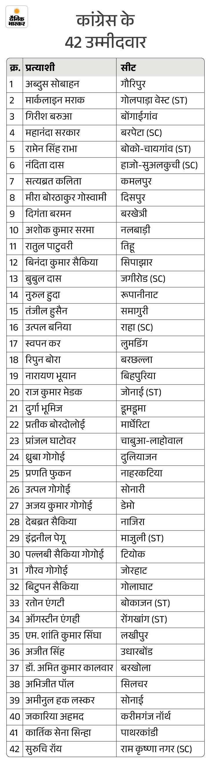 Congress on Tuesday released its first list of 42 candidates for the upcoming Assam Assembly elections. Assam Congress president and MP Gaurav Gogoi will contest from Jorhat assembly seat.