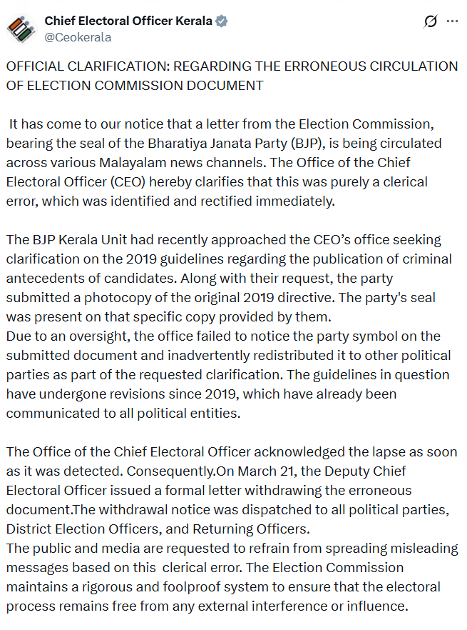 “It has come to our notice that a letter from the Election Commission, bearing the seal of the BJP, is being circulated across various Malayalam news channels. The Office of the Chief Electoral Officer (CEO) hereby clarifies that this was purely a clerical error, which was identified and rectified immediately,” the statement said.