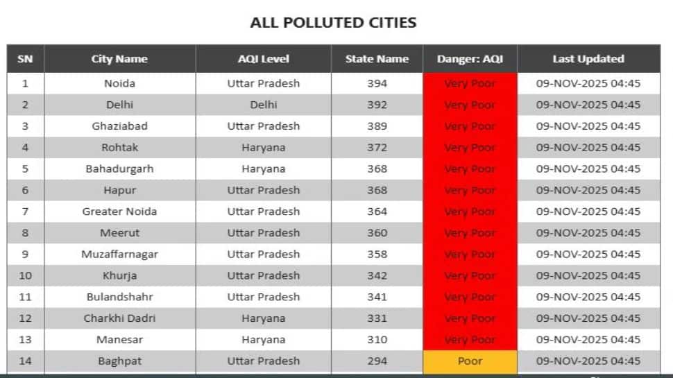 Delhi NCR Air Pollution: Delhi and the National Capital Region (NCR) are grappling with a severe pollution crisis. Noida, Delhi and Ghaziabad rank among the most polluted cities in India, with Noida at the top, Delhi second and Ghaziabad third. Rohtak and Bahadurgarh in Haryana follow, while Gurugram records poor air but ranks 24th. The ongoing cold and forecasted weather patterns show no immediate relief from the rising pollution levels. Authorities are closely monitoring the situation.