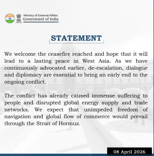 In an official statement issued on April 8, the Ministry of External Affairs (MEA) said, “We welcome the ceasefire reached and hope that it will lead to a lasting peace in West Asia.”