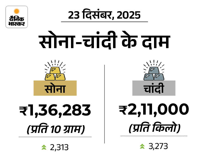 At the same time, the price of 1 kg silver has increased by Rs 3,273 to reach an all-time high of Rs 2,11,000 per kg. Earlier on Monday its price was ₹ 2,07,727/kg. Silver has become costlier by Rs 25,512 in ten days. On December 10, its price was Rs 1,85,488 per kg.