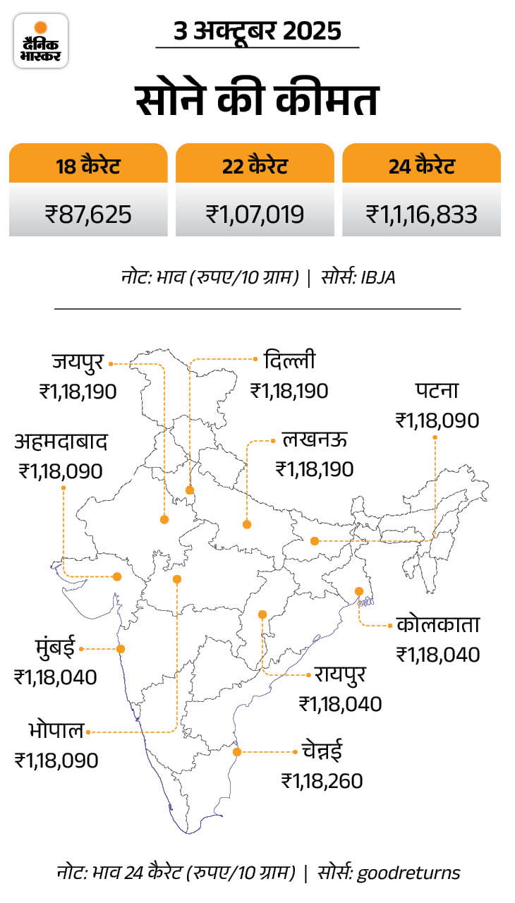 Gold and silver prices have declined today i.e. October 3. According to the India Bullion and Jewelers Association (IBJA), 10 grams 24 carat gold declined by Rs 500 to Rs 1,16,833. At the same time, the price of silver has also fallen by Rs 110 to Rs 1,45,010 per kg. On 1 October, gold made an all -time high of Rs 1,17,332 and silver by Rs 1,45,120.
