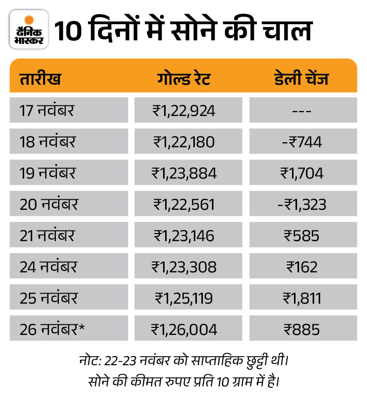 There is a rise in the prices of gold and silver today i.e. on Wednesday, 26th November. According to India Bullion and Jewelers Association (IBJA), 10 grams of gold has become costlier by Rs 885 and reached Rs 1,26,004. Yesterday 10 grams of gold was worth Rs 1,25,119.