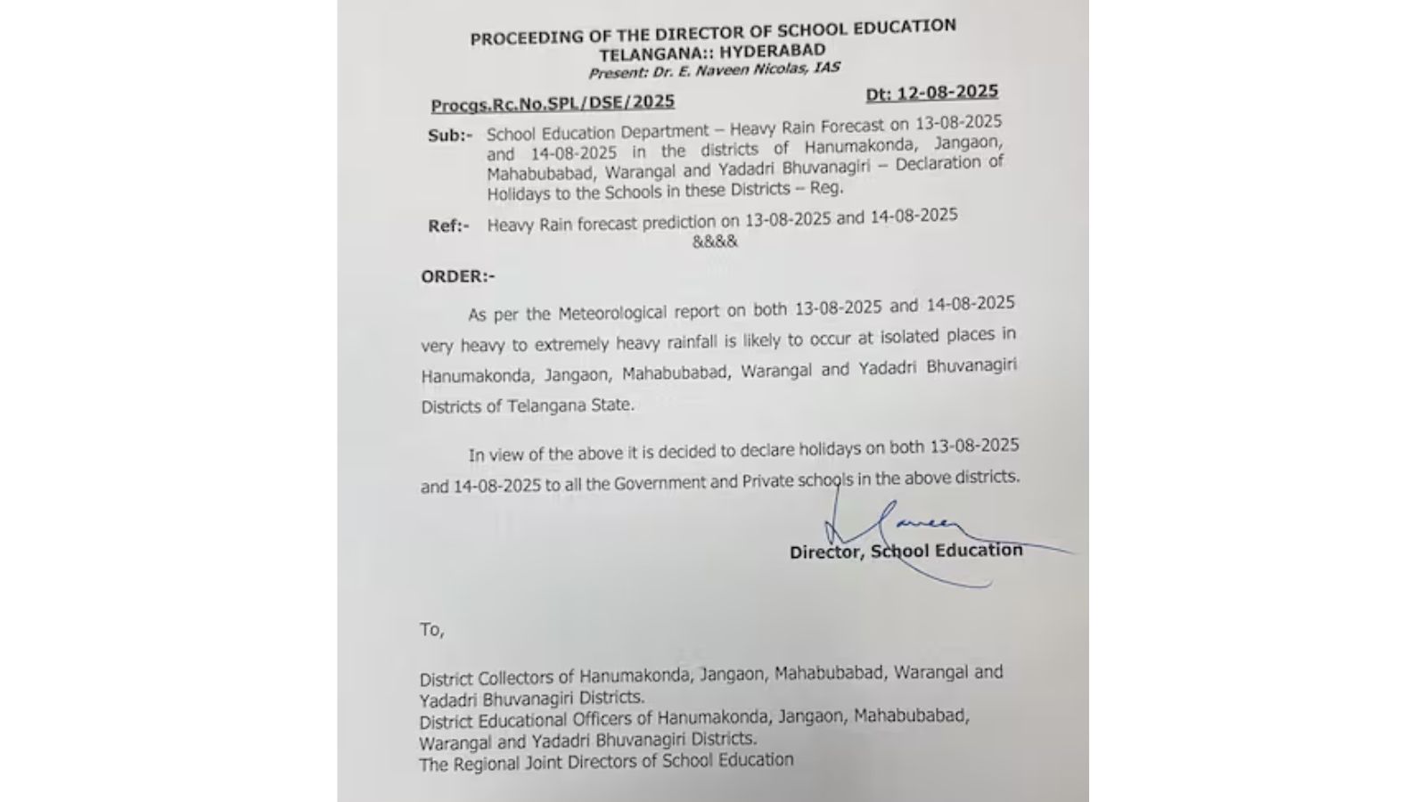 The Indian Meteorological Department has announced that Telangana will experience very heavy rains for two days, Wednesday and Thursday. The government and officials are on alert and have declared holidays for schools in Warangal, Hanmakonda, Mahabubabad, Janagama, Yadadri, and Bhuvanagiri districts on these days.