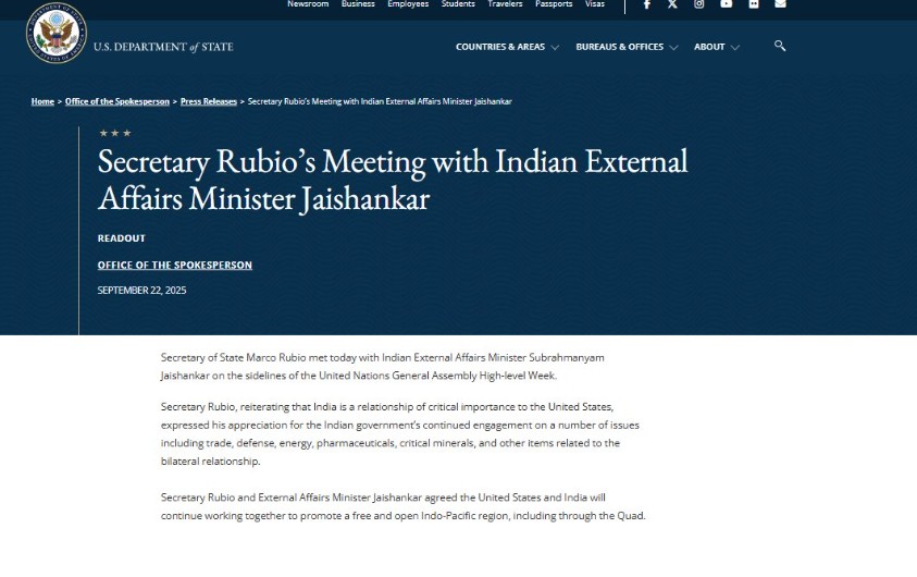 A US release stated India as of ‘critical importance’ to Washington after Marco Rubio and EAM Jaishankar met at the UNGA sidelines to discuss trade, energy, defence.