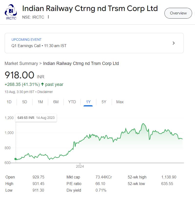 IRCTC’s stock today fell 0.69% to close at ₹918. In the last one year, the company’s stock has given investors a return of 41.31%. In the last 6 months, the stock has risen by only 0.83%. The company’s market cap is Rs 73.44 thousand crores.