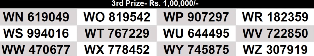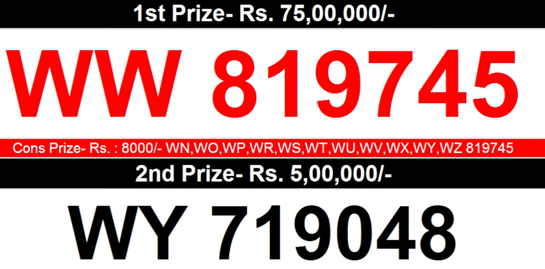 WINNING NUMBER FOR 1ST PRIZE OF RS 75 LAKH IS WW 819745