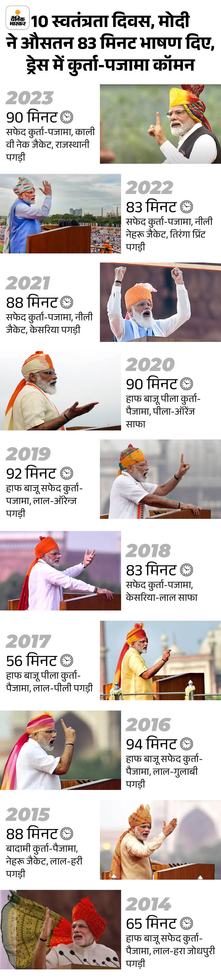 Last year, the Independence Day celebrations at the Red Fort lasted for about two and a half hours. Modi was seen in an off-white kurta and a black jacket. He wore a Jodhpuri bandhani print safa. Which had yellow, green and red colors. PM Modi gave a 90-minute speech. Modi also gave 3 guarantees to the countrymen.