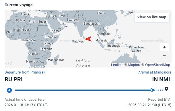 The tanker Aqua Titan is now expected to reach New Mangalore on March 21, carrying Urals crude it picked up from a Baltic Sea port in late January, according to vessel-tracking data. The Aframax ship had initially listed Rizhao in China as its destination, but reversed course in Southeast Asian waters around mid-March—just days after the US cleared India to temporarily step up purchases of Russian oil.