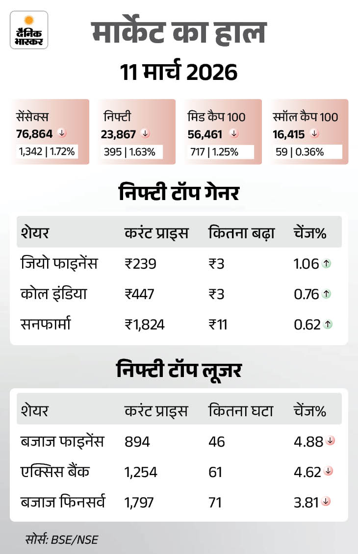 There was a decline in the market yesterday Earlier yesterday i.e. on March 11, there was a decline in the stock market. The Sensex closed at 76,864 with a fall of 1342 points (1.72%). At the same time, Nifty also declined by 395 points (1.63%), it closed at 23,867.