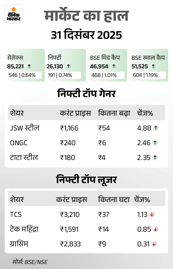 There was a rise in the stock market on the last day of the year i.e. today, 31st December. Sensex closed at 85,221, up 546 points. There was a rise of 191 points in Nifty, it closed at 26,130.