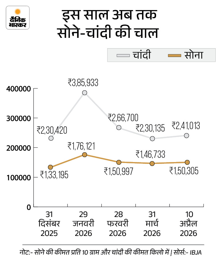During this period, on January 29, gold had made an all-time high of Rs 1.76 lakh and silver had also made an all-time high of Rs 3.86 lakh. But, after the start of America and Israel’s war with Iran on February 28, a continuous decline is being seen. Since then, in 42 days, gold has fallen by Rs 8,792 and silver by Rs 25,687.