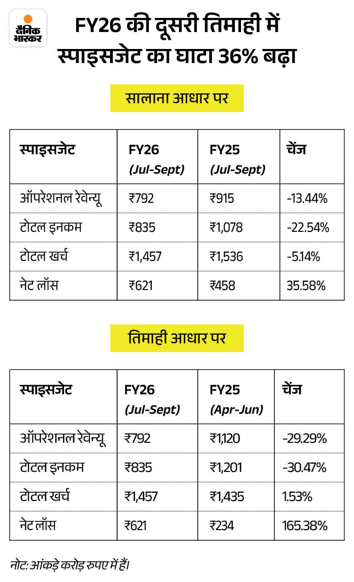 • SpiceJet Q2FY26 Loss Widens 35% To ₹621 Crore; Revenue Slumps 13% As Stock Falls 37% In 2025