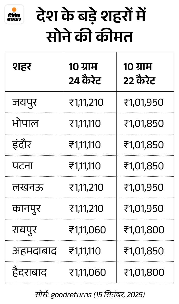 Delhi: 24 carat gold price ₹ 1,11,210 and 22 carat gold priced ₹ 1,01,950 Mumbai: 24 carat gold price ₹ 1,11,060 and 22 carat gold priced ₹ 1,01,800 Kolkata: 24 carat gold price ₹ 1,11,060 and 22 carat gold priced ₹ 1,01,800 Chennai: 24 carat gold price ₹ 1,11,380 and 22 carat gold priced ₹ 1,02,100